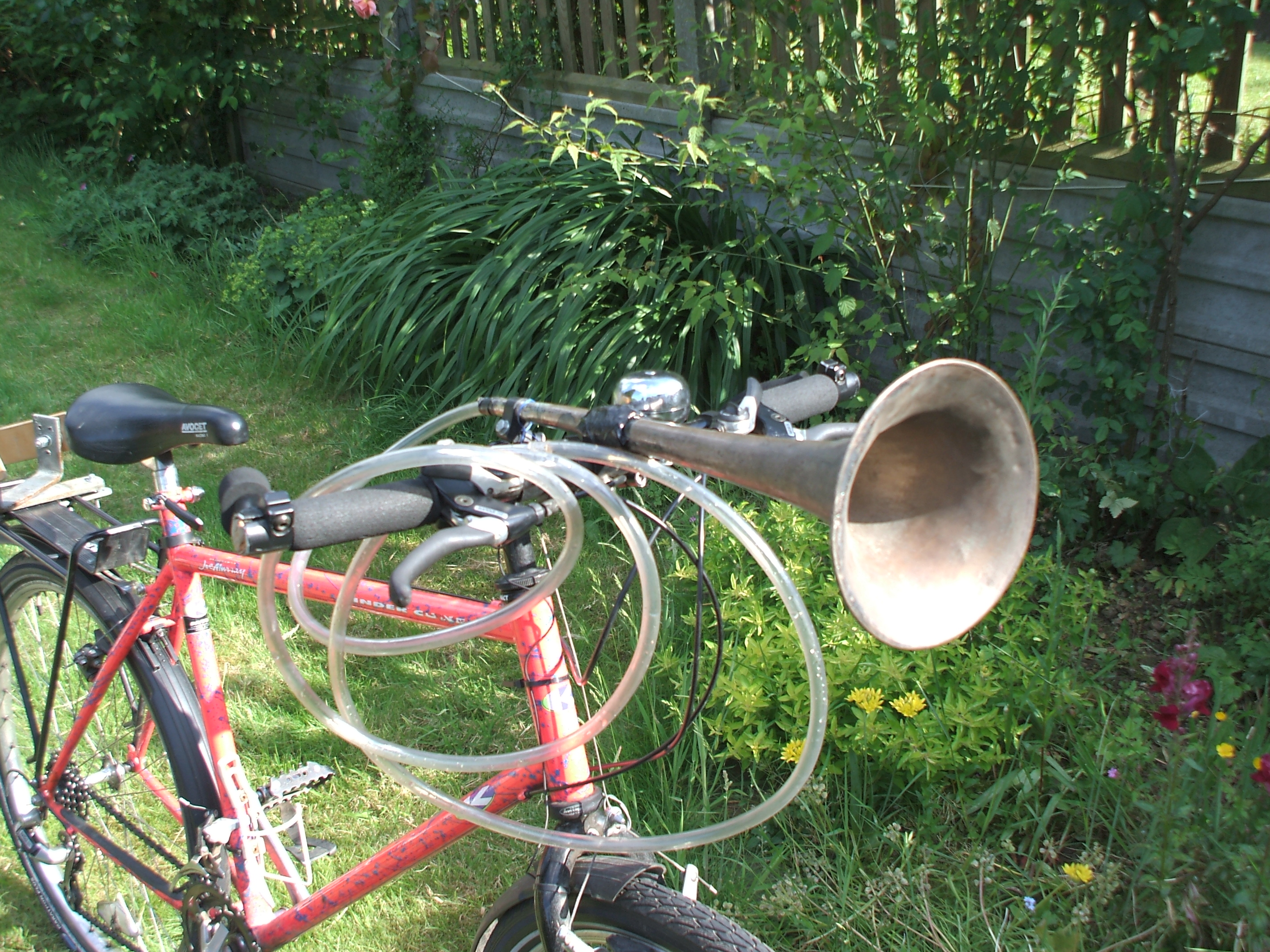 The trombone horn can be blown using a mouthpiece on the end of the plastic tubing