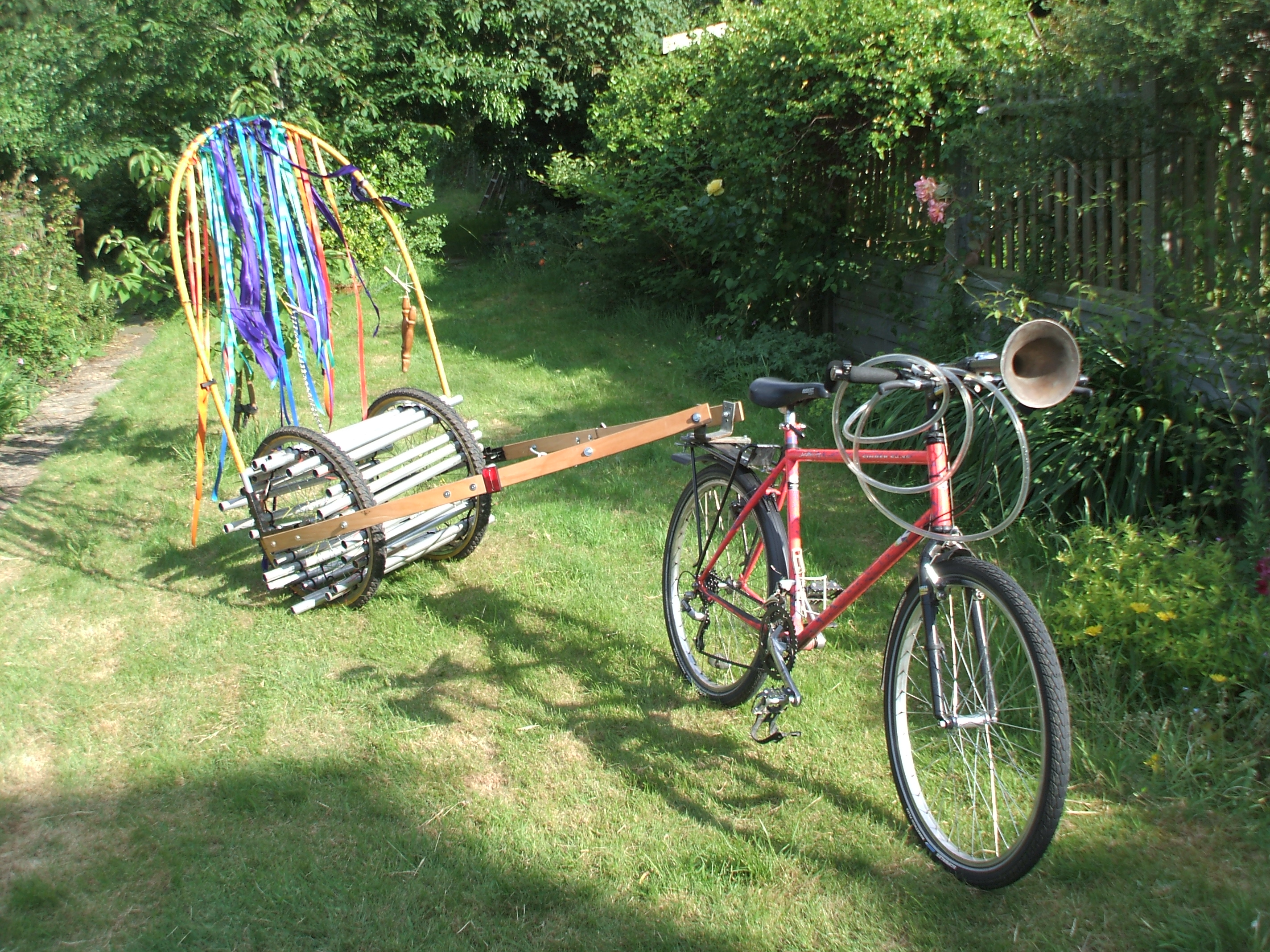The Nancarrow Barrow was made in 2008 as a response to the Critical Mass Cycle Rides that can become quite confrontational, offering a celebration of cycling to Londoners. It is named after the American composer Conlon Nancarrow (who wrote many studies for mechanical player pianos). It is made from reclaimed materials. The music is created by the wooden objects inside the Barrow falling on the chime bars as the wheels roll and the beaters hanging from the arch above the back wheels strike the chime bars as they pass. The music changes as the speed changes.