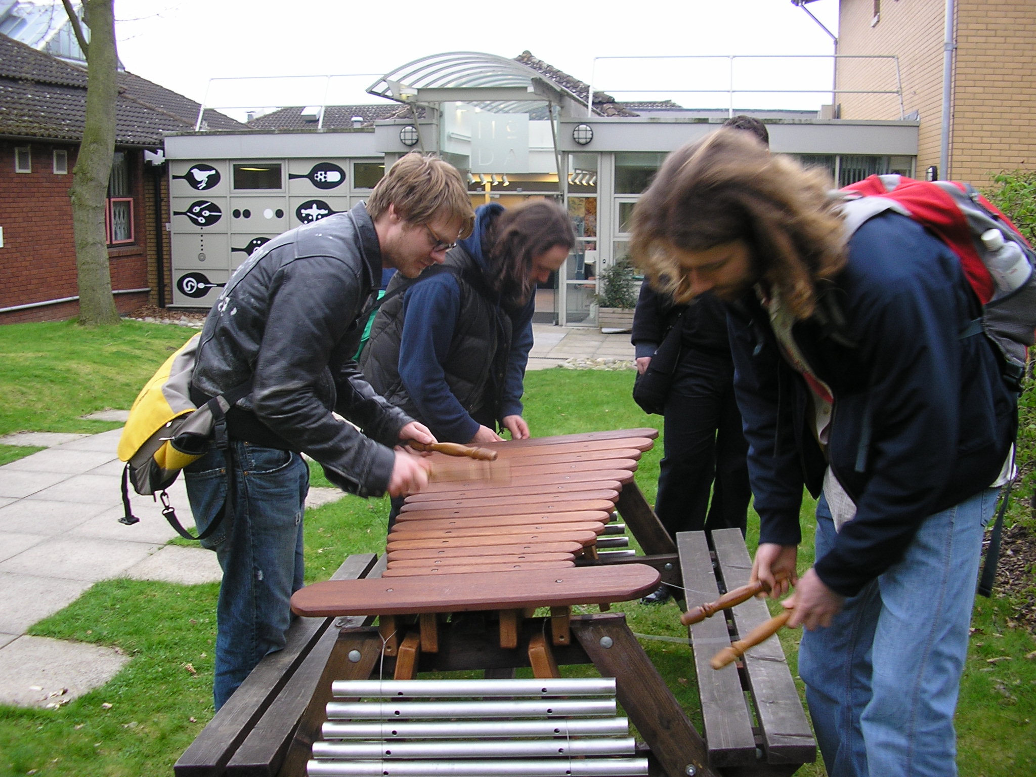 Created for the Museum of Domestic Design and Architecture’s “Eating in the Great Outdoors” exhibition, a standard picnic table was transformed into a giant marimba, with metallophones at each end and low pitch tube gongs under each bench seat. The aluminium tubing was reclaimed from gym apparatus. The teak wood used for the marimba’s keys was reclaimed from handrails from the same condemned school.